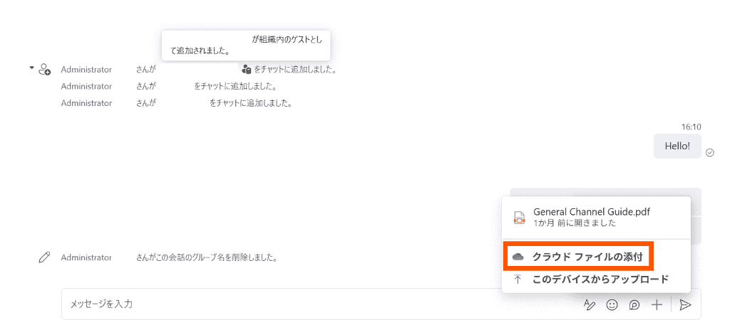 - Teams でゲスト ユーザーが含まれるグループ チャットにアクセスし、[+] > [ファイルを添付する] > [クラウド ファイルの添付] をクリックします