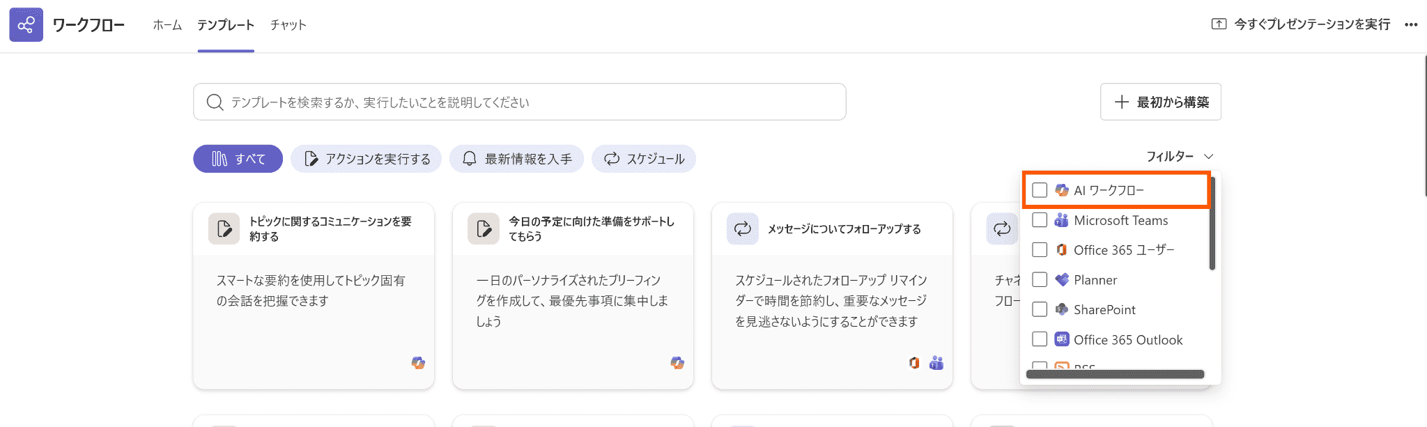 📝 ワークフロー アプリの [テンプレート] タブ > [フィルター] の [AI ワークフロー] を選択することで、AI ワークフローのテンプレート一覧を確認することが可能です。