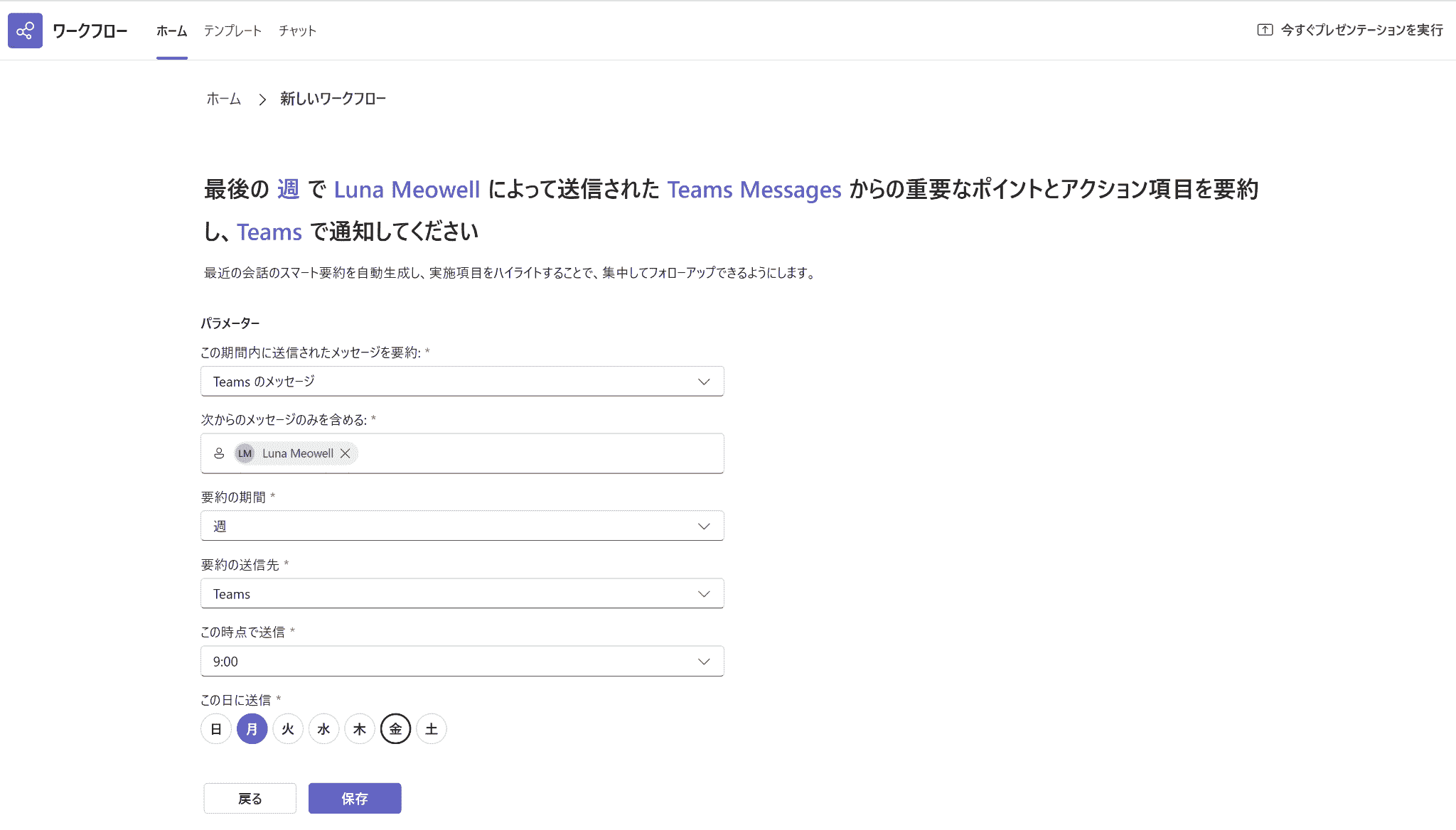 - どのユーザーとのコミュニケーションを対象とするか・いつ・どの頻度で通知を受け取りたいか などの設定を行います。ここでは、”Luna Meowell” というユーザーとの Teams チャットの内容を要約するように指定しています。