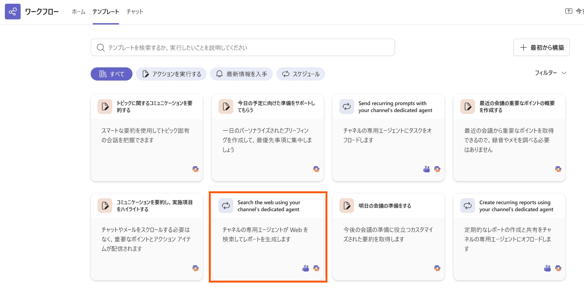 📖 チャネル エージェントの追加方法については、こちら の公開情報をご参照ください。 - テンプレート一覧から任意のテンプレートを選択。ここでは「Search the web using your channel’s dedicated agent」を選択します。