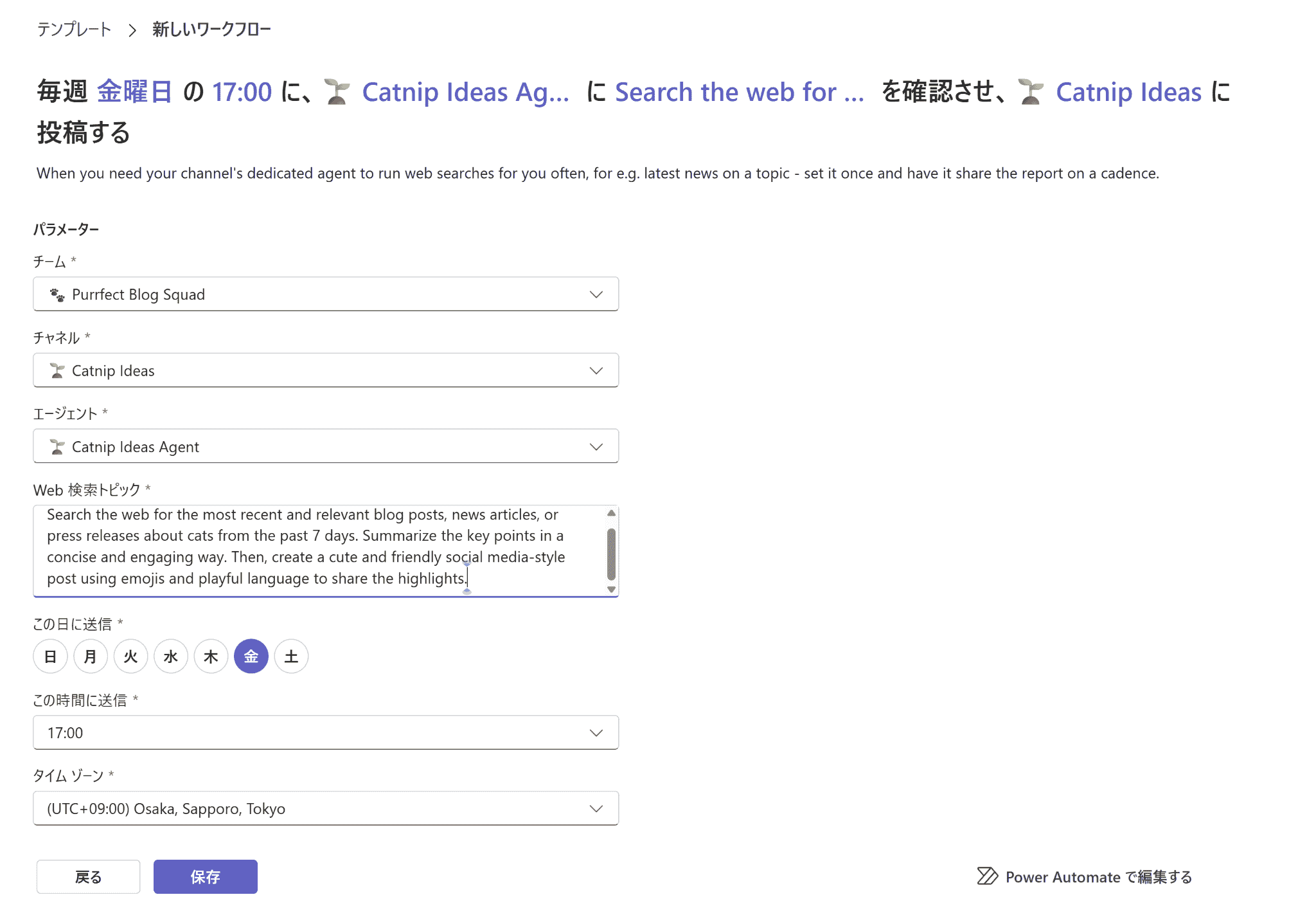 - フローの中身を設定します。ここでは 毎週金曜の 17 時に [🌱 Catnip Ideas] というチャネルに猫に関するニュースやブログ記事のリサーチ結果を投稿してもらうように指示しています。