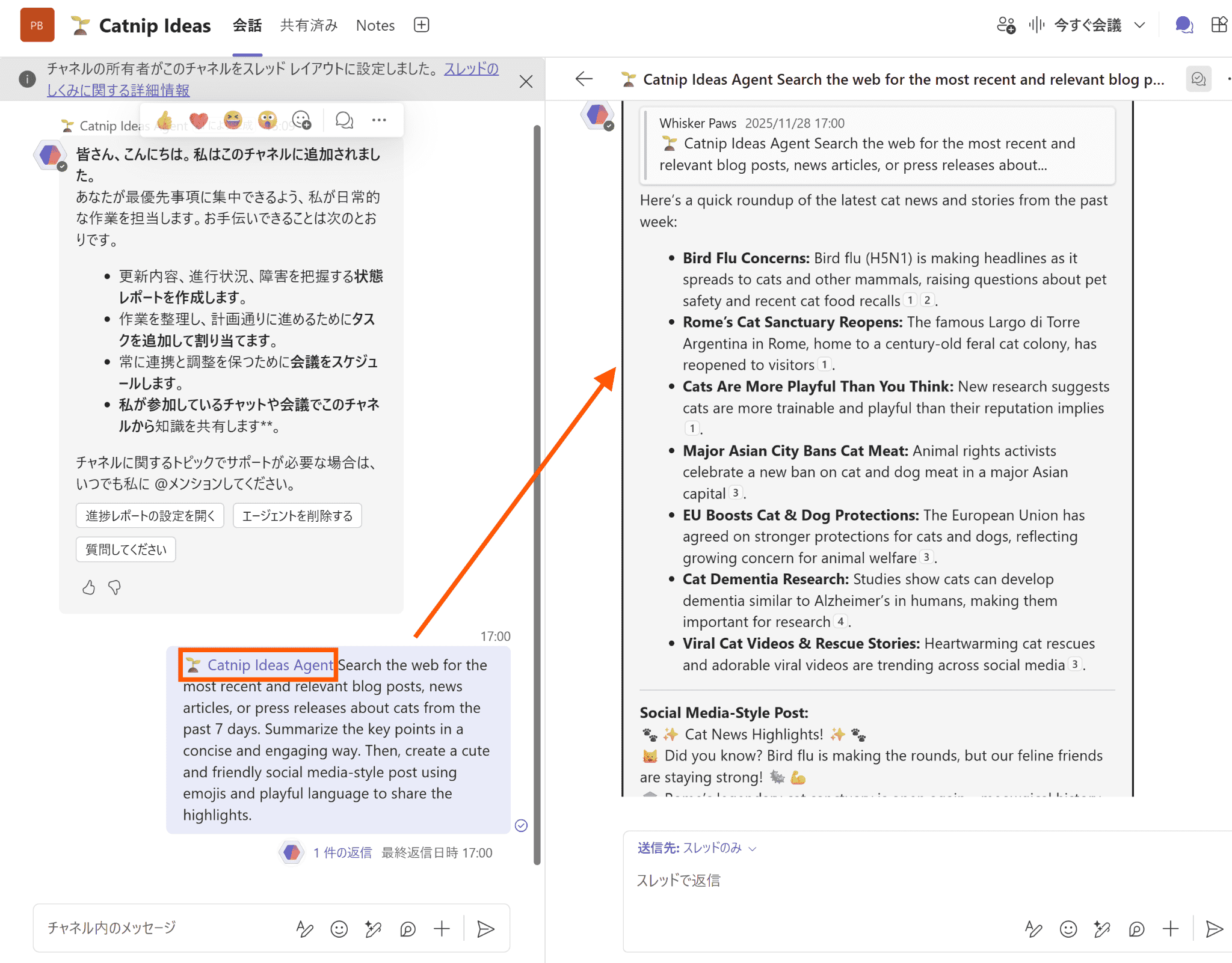 またチャネル エージェントからの応答は、投稿への返信として返されます。🐈