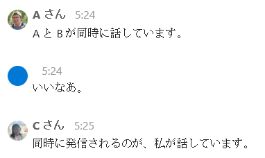 以下のように A さんと B さんが同時に発声し、C さんもそれにかぶせるように発声したときにどうなるかの確認です。