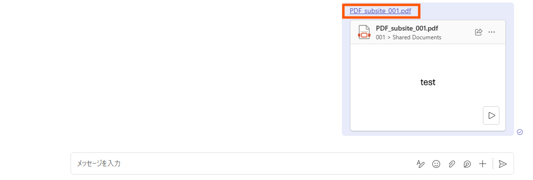 現在、Teams メッセージに SharePoint Online (以下 SPO) のサブサイト上に保存された PDF ファイルの共有リンクを貼り付けて投稿した場合、